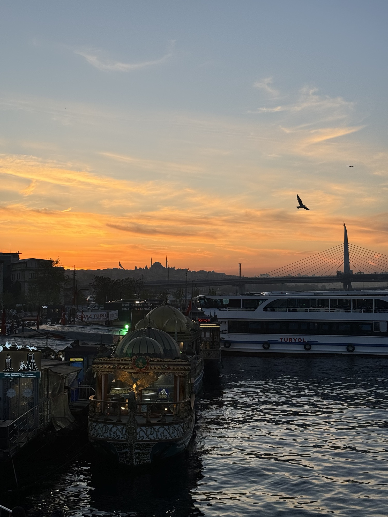 We grabbed something small to eat nearby and then sat by the Bosphorus for a while, just watching the boats go by. Boats passed by slowly, the sky turned soft orange and pink, and everything felt calm and magical.